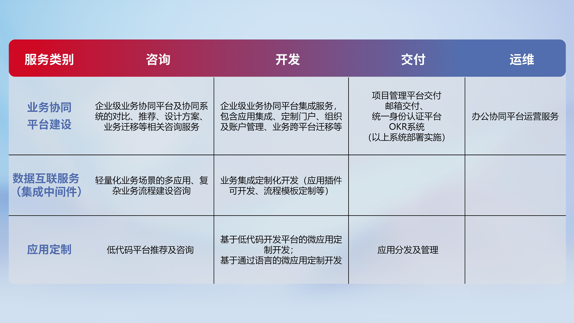 针对钉钉、、企微、、、、IDaas等平台级产品提供产品的规划、、方案、、交付、、定制化开发等服务,,,,实现如统一协同办公、、、、智能客户服务、、、、混合会议管理、、、、智能数据查询、、、、等业务场景,,,,实现数字化转型。。